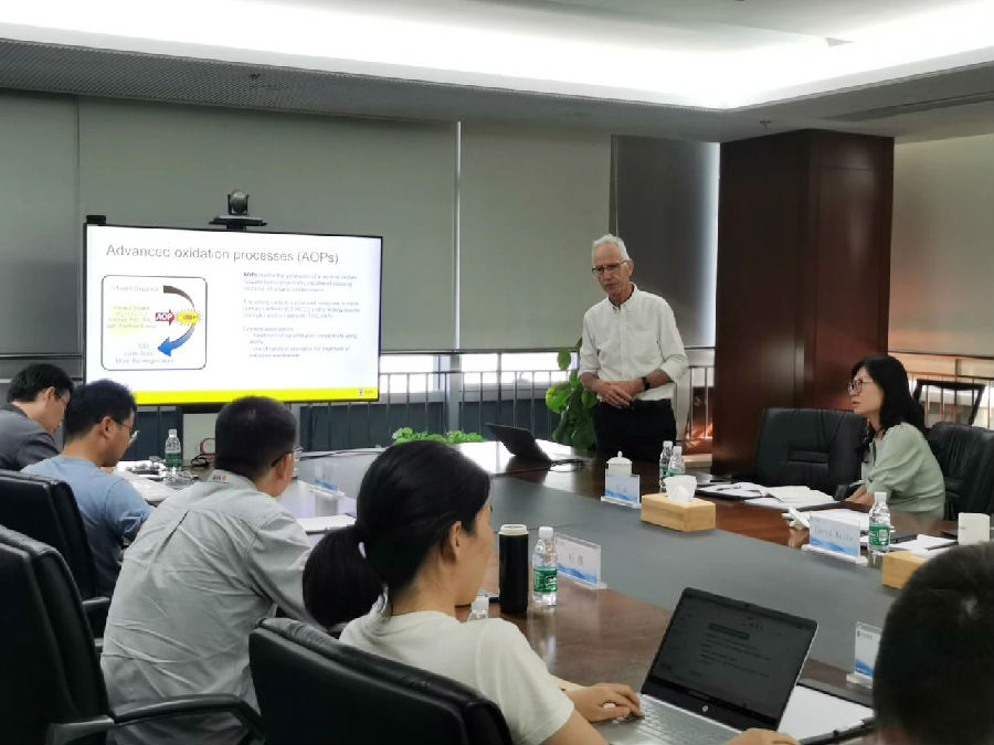 石偉首先對David Waite一行的到來表示熱烈的歡迎,并介紹了光大水務(wù)公司概況。他表示,光大水務(wù)以水環(huán)境綜合治理為主業(yè),業(yè)務(wù)范圍覆蓋原水保護(hù)、供水、市政污水處理、工業(yè)廢水處理、中水回用、流域治理及污泥處理處置等領(lǐng)域。近年來,公司持續(xù)投入研發(fā),對內(nèi)不斷夯實(shí)工藝包技術(shù)的質(zhì)量,對外通過技術(shù)創(chuàng)新不斷開拓新業(yè)務(wù)領(lǐng)域,充分踐行“打造具有中國特色的世界一流環(huán)境綜合服務(wù)商”的企業(yè)愿景。